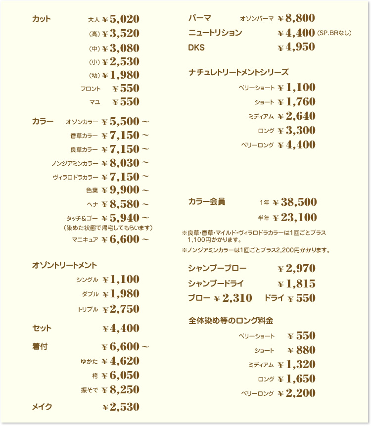 ※良草・香草・マイルド・ヴィラロドラカラーは 1回ごとプラス1,100円かかります。 ※ノンジアミンカラーは1回ごとプラス2,200円 かかります。